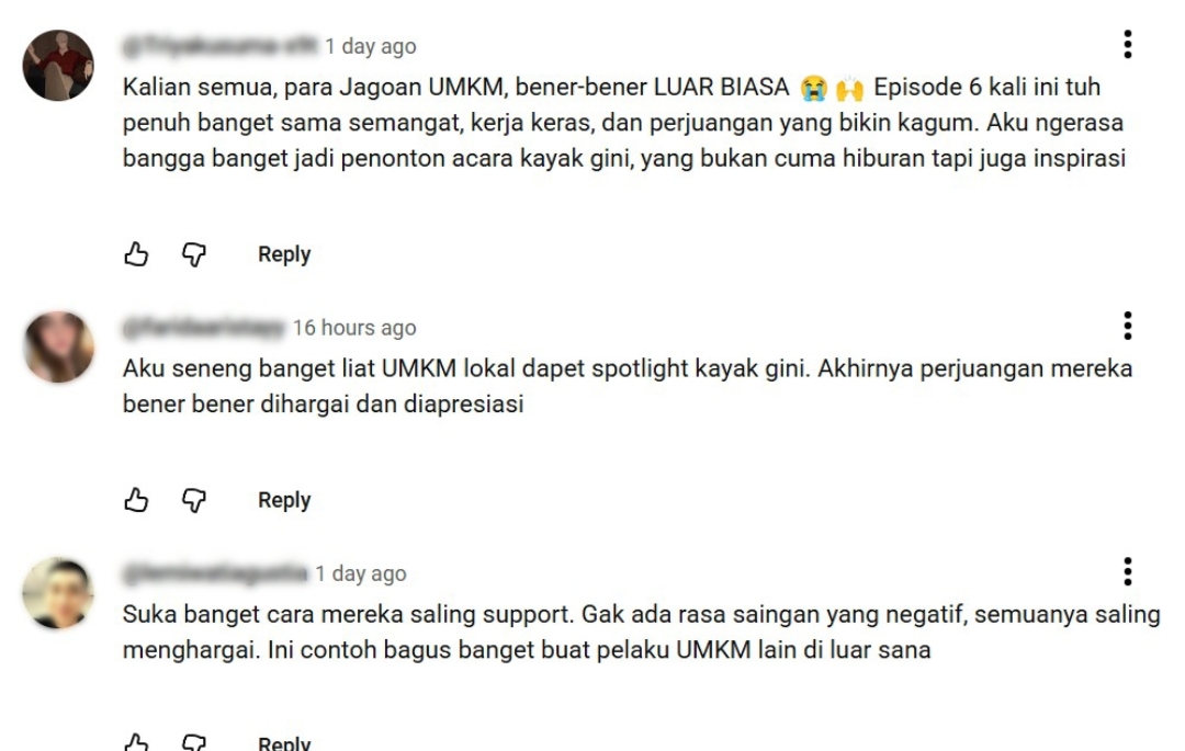 Banyak penonton mengaku terinspirasi oleh semangat dan keteguhan para pengusaha UMKM yang menghadirkan kisah perjuangan nyata penuh emosi dan motivasi, terlihat dari kolom komentar YouTube Shopee Indonesia yang dipenuhi ungkapan dukungan dan apresiasi dari netizen. Setiap tayangan tidak hanya memancing decak kagum, tetapi juga membangkitkan rasa bangga terhadap kreativitas dan daya juang anak bangsa yang berani berinovasi dan terus berusaha untuk naik kelas.