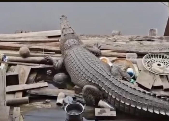 JEKTVNEWS.COM,-Seekor buaya muara terlihat muncul dan berjemur di salah satu jamban sungai di belakang rumah warga, tepatnya di Desa Serdang, Kecamatan Betara, Kabupaten Tanjung Jabung Barat, pada Jumat, 21 November 2025.